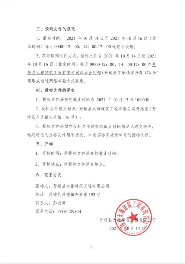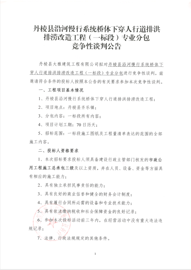 【大雅建筑公司】丹棱縣沿河慢行系統(tǒng)橋體下穿人行道排洪排澇改造工程(一標段)專業(yè)分包競爭性談判公告