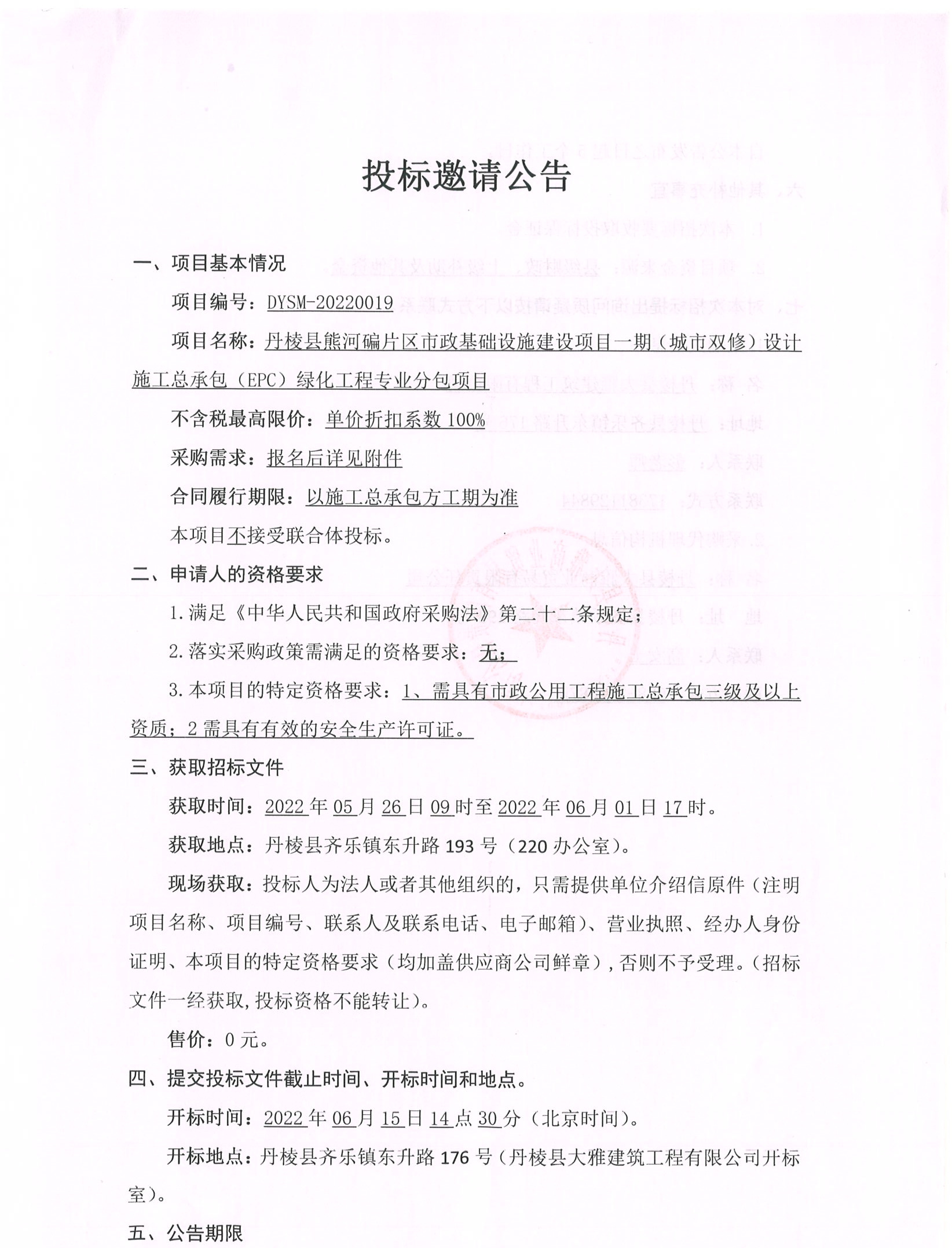 丹棱縣熊河碥片區(qū)市政基礎(chǔ)設(shè)施建設(shè)項(xiàng)目一期(城市雙修)設(shè)計(jì)施工總承包(EPC)綠化工程專業(yè)分包項(xiàng)目投標(biāo)邀請公告
