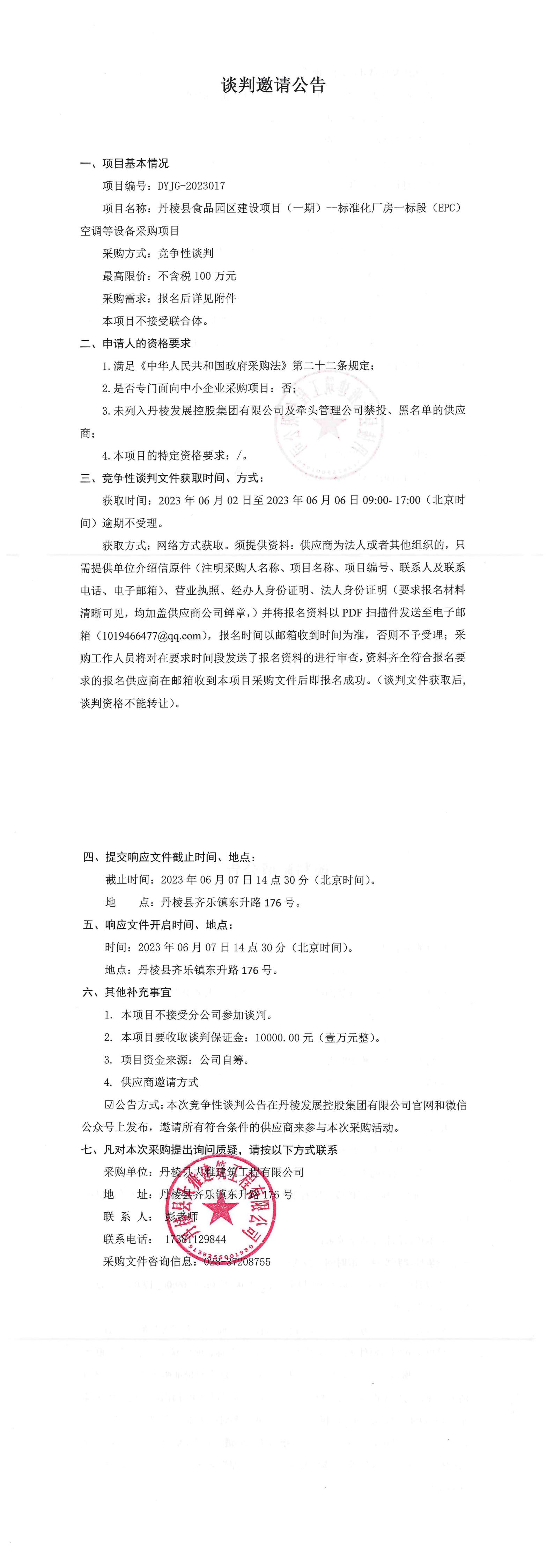 丹棱縣食品園區(qū)建設(shè)項(xiàng)目(一期)--標(biāo)準(zhǔn)化廠房一標(biāo)段(EPC)空調(diào)等設(shè)備采購項(xiàng)目談判邀請公告