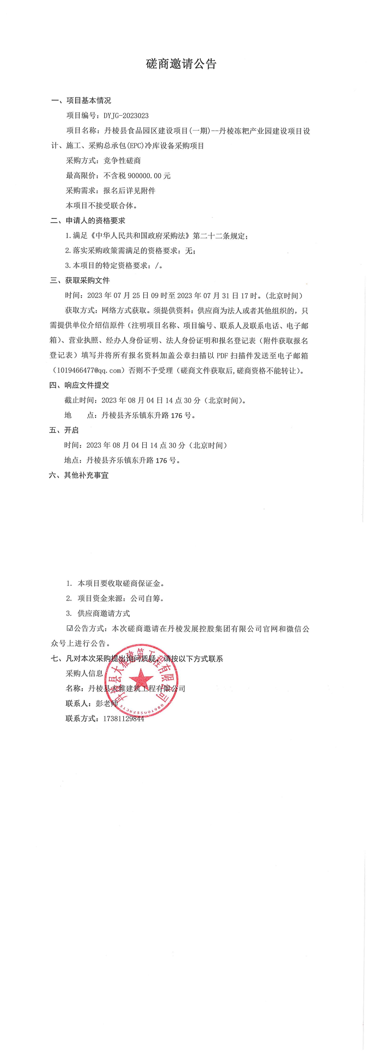 丹棱縣食品園區(qū)建設項目(一期)--丹棱凍粑產業(yè)園建設項目設計、施工、采購總承包(EPC)冷庫設備采購項目磋商邀請公告