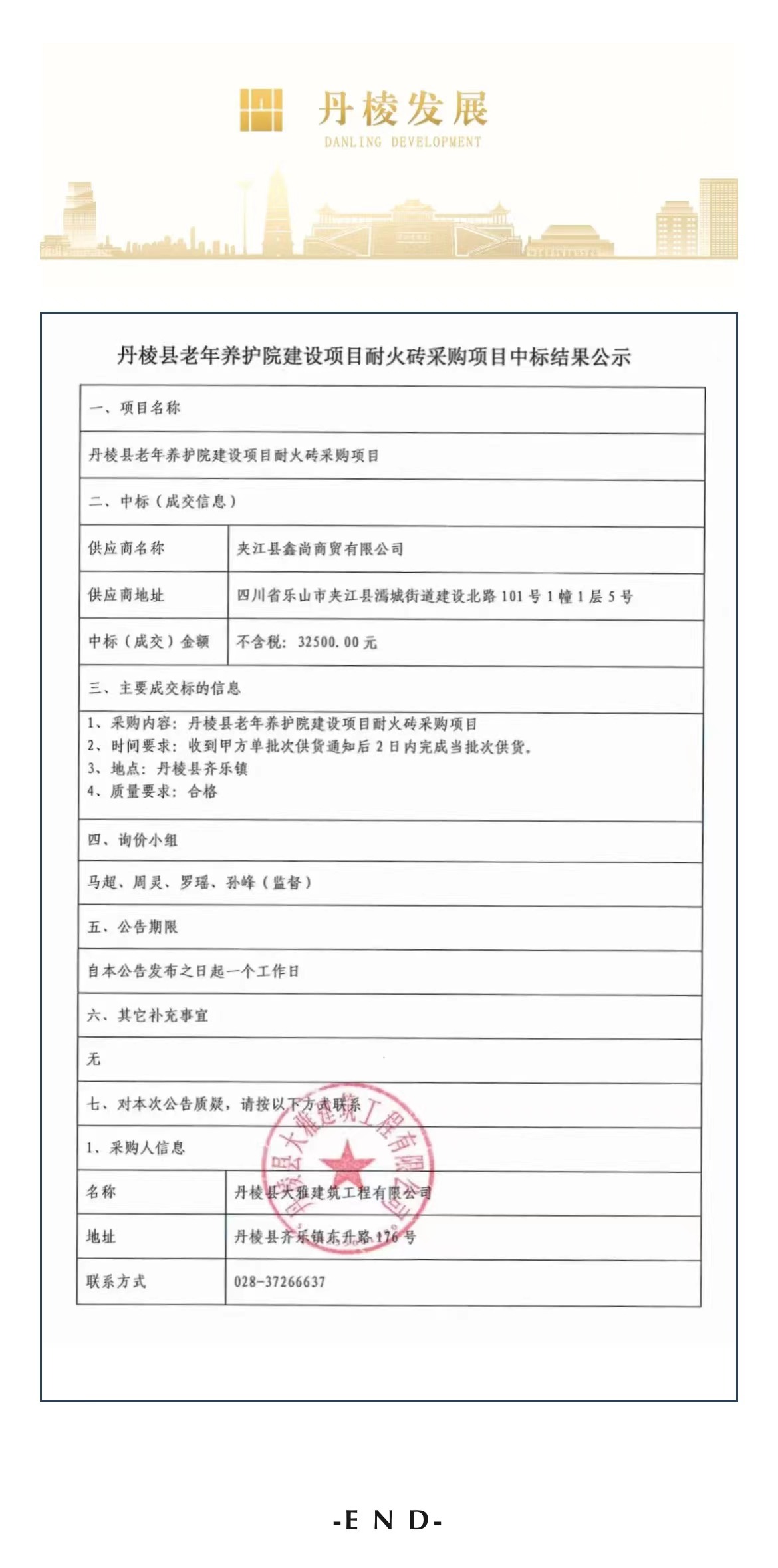 丹棱縣老年養(yǎng)護(hù)院建設(shè)項(xiàng)目耐火磚采購項(xiàng)目中標(biāo)結(jié)果公示