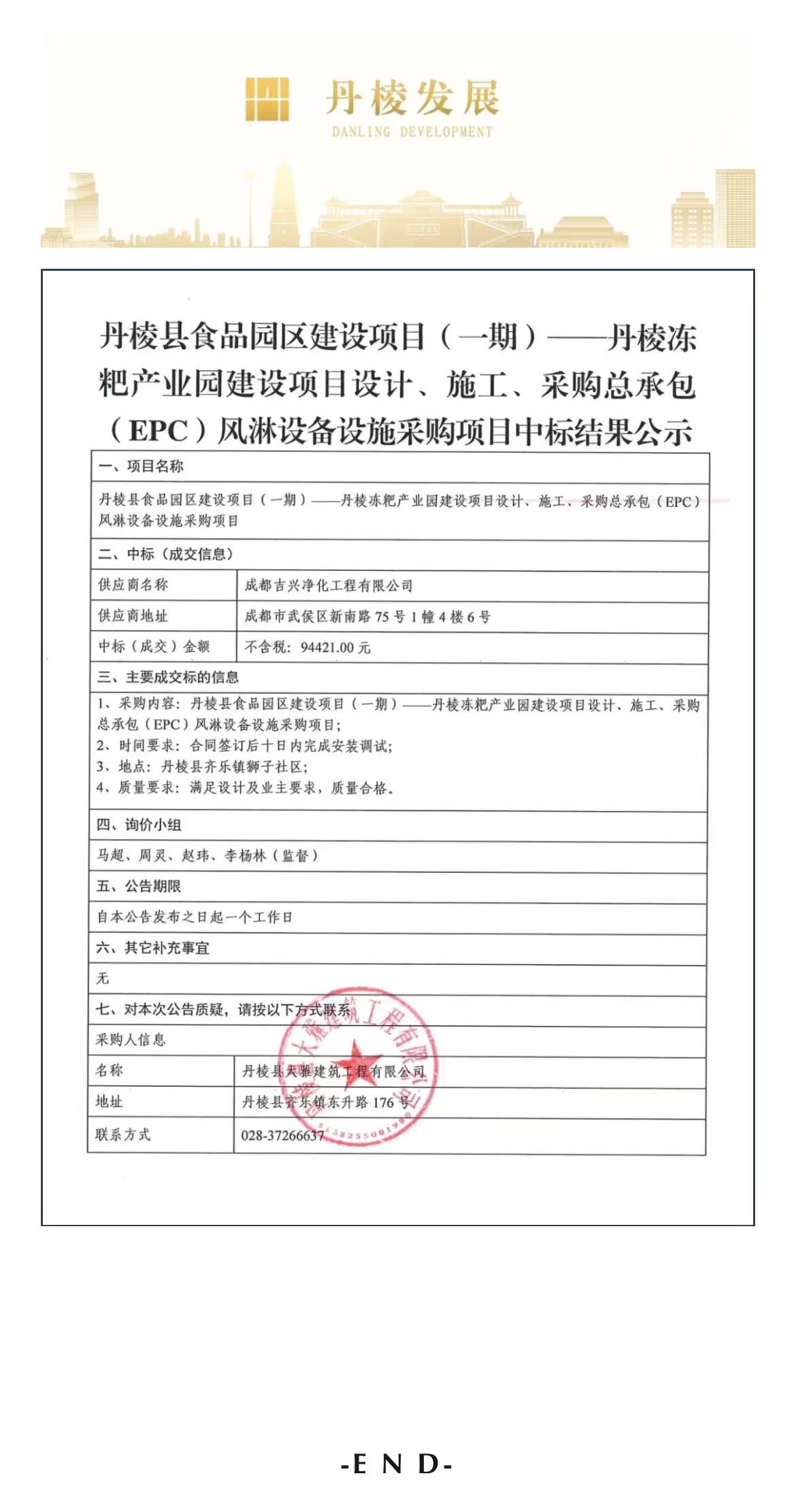 丹棱縣食品園區(qū)建設項目(一期)—丹棱凍粑產業(yè)園建設項目設計、施工、采購總承包(EPC)風淋設備設施詢價采購項目中標結果公示