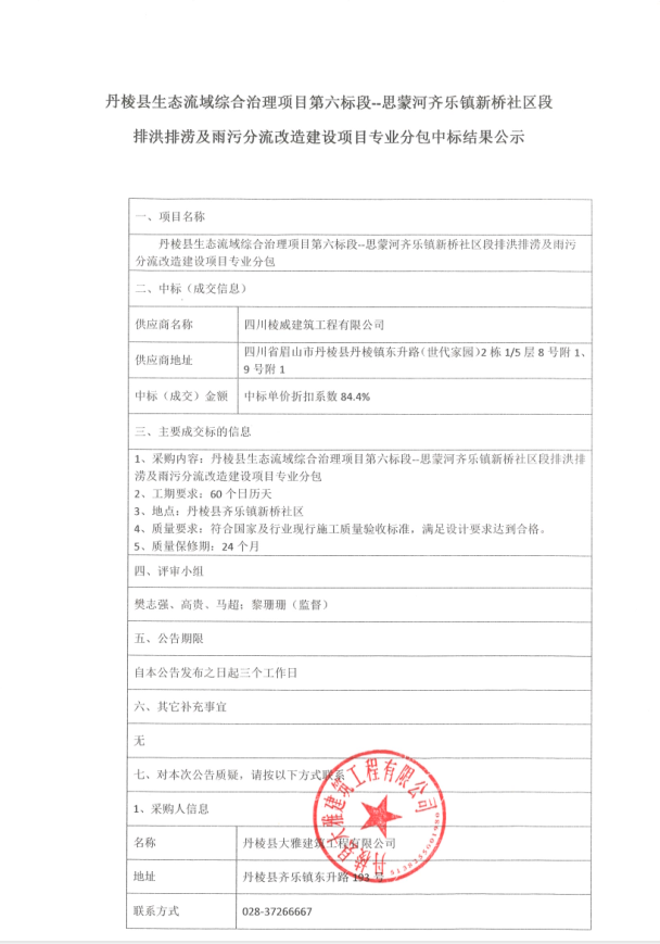 【大雅建筑公司】丹棱縣生態(tài)流域綜合治理項目第六標(biāo)段—思蒙河齊樂鎮(zhèn)新橋社區(qū)段排洪排澇及雨污分流改造建設(shè)項目專業(yè)分包中標(biāo)結(jié)果公示