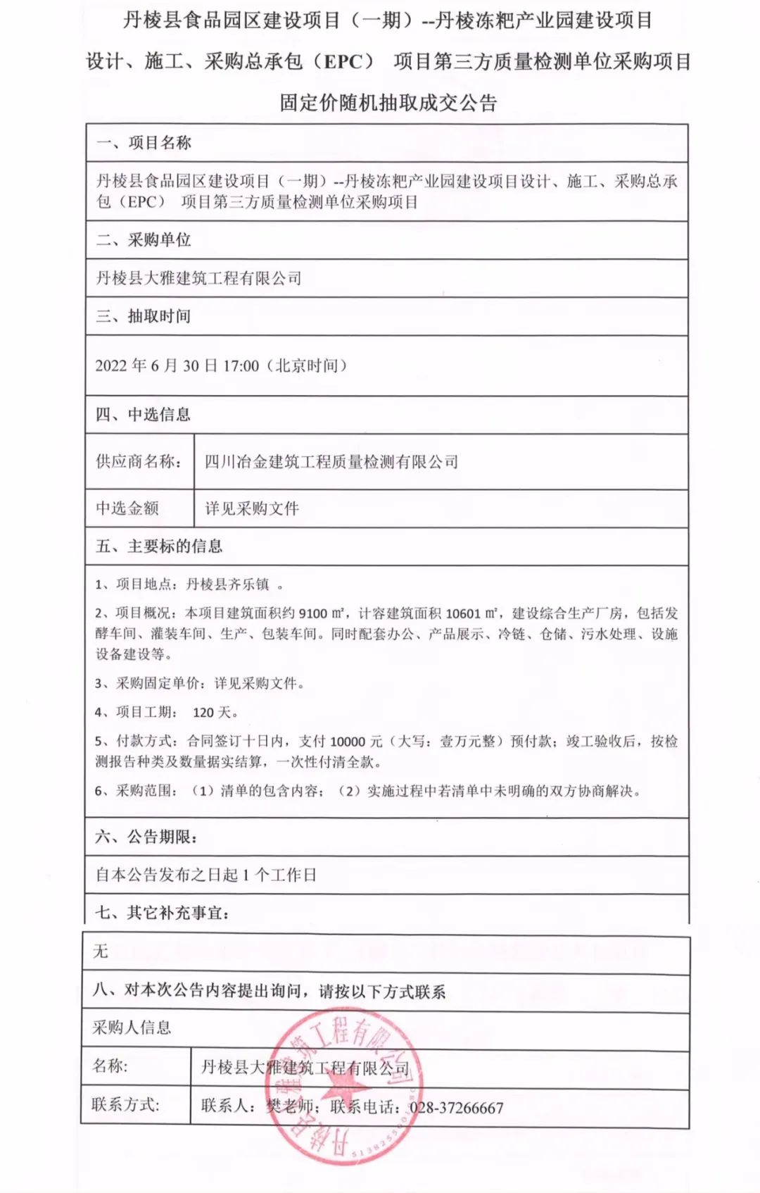 丹棱凍粑產(chǎn)業(yè)園建設(shè)項(xiàng)目設(shè)計(jì)、施工、采購總承包(EPC)項(xiàng)目第三方質(zhì)量檢測(cè)單位采購項(xiàng)目固定價(jià)隨機(jī)抽取成交公告