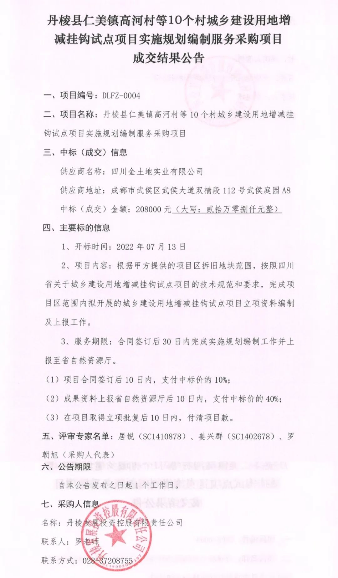 丹棱縣仁美鎮(zhèn)高河村等10個村城鄉(xiāng)建設用地增減掛鉤試點項目實施規(guī)劃編制服務采購項目成交結果公告