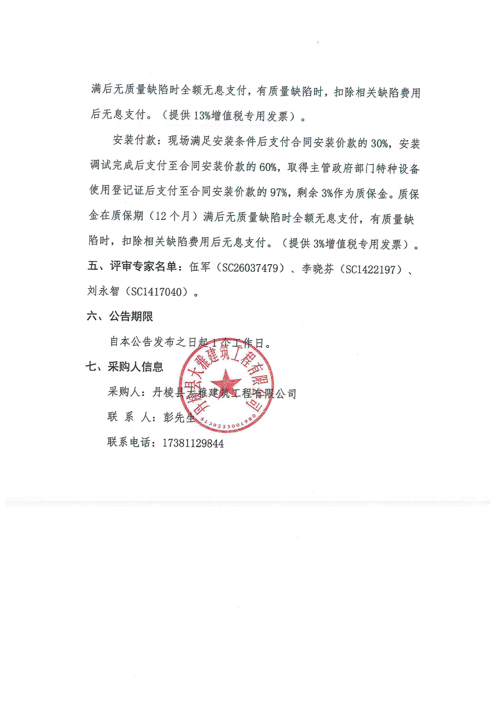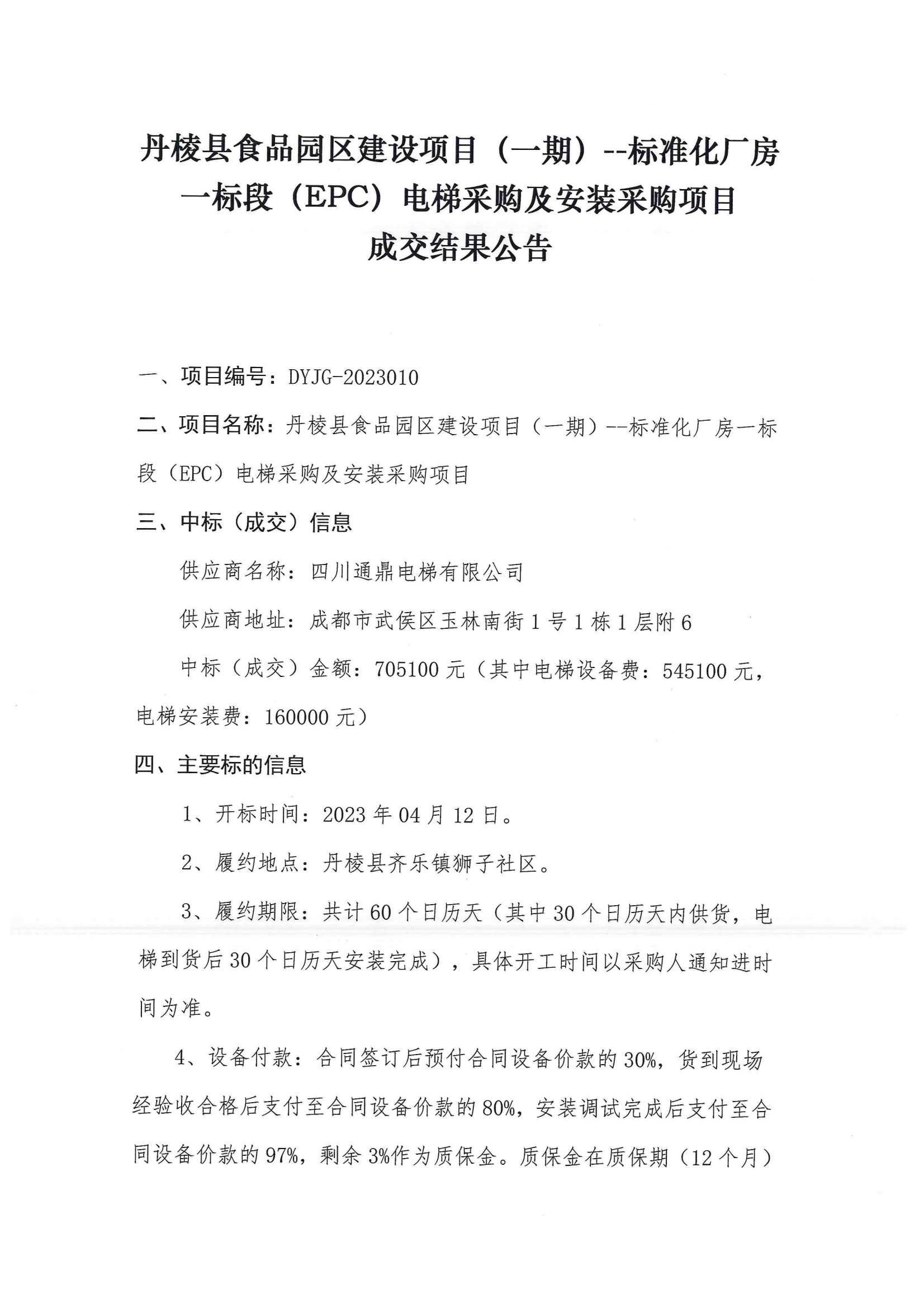 丹棱縣食品園區(qū)建設(shè)項目(一期)--標(biāo)準(zhǔn)化廠房一標(biāo)段(EPC)電梯采購及安裝采購項目成交結(jié)果公告