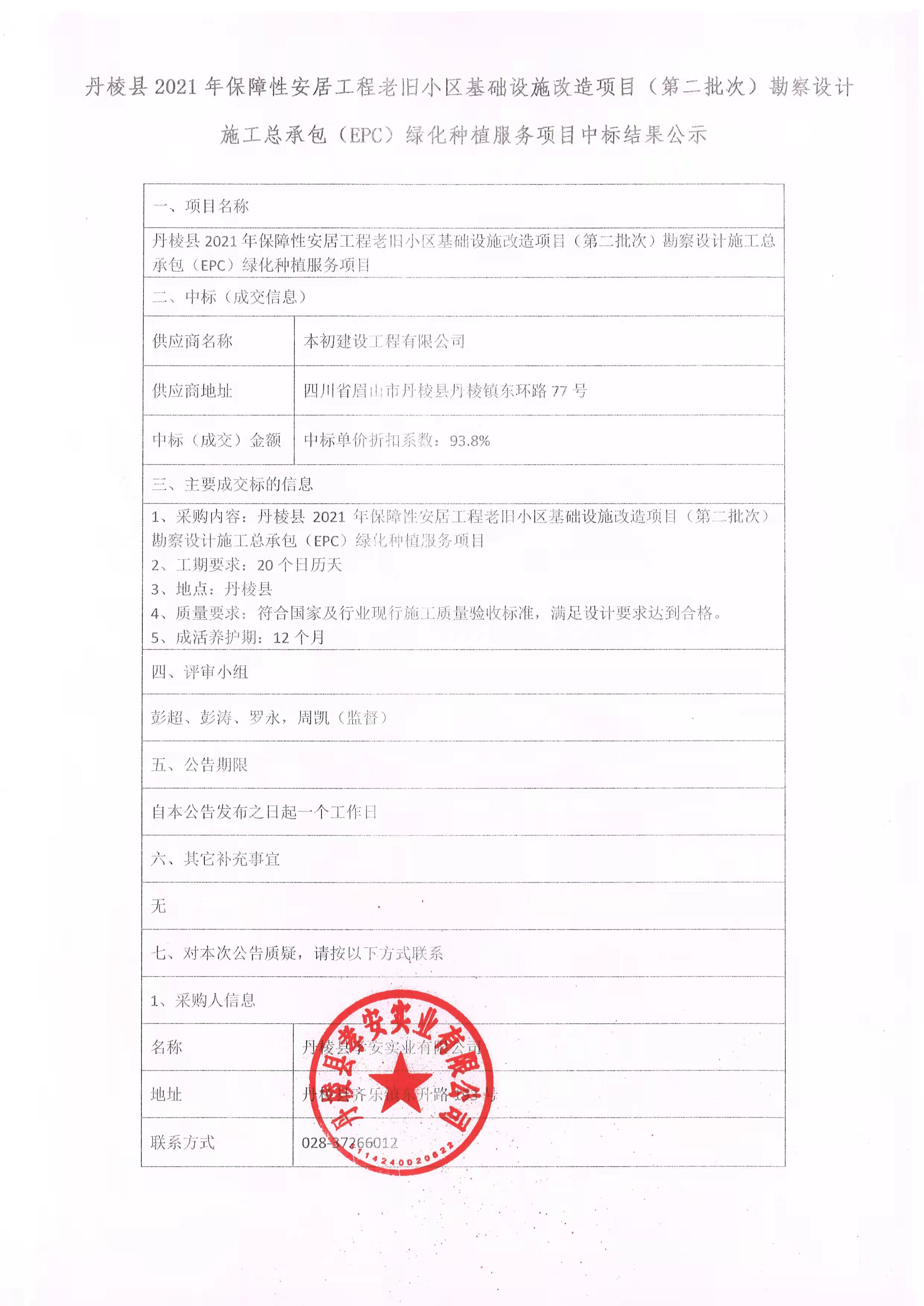 【縣孝安公司】丹棱縣2021年保障性安居工程老舊小區(qū)基礎(chǔ)設(shè)施改造項目(第二批次)勘察設(shè)計施工總承包(EPC)綠化種植服務(wù)項目中標(biāo)結(jié)果公示