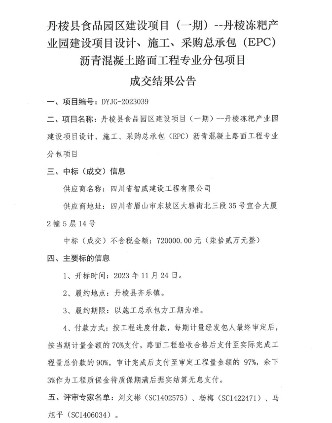 丹棱縣食品園區(qū)建設(shè)項(xiàng)目(一期)—丹棱凍粑產(chǎn)業(yè)園建設(shè)項(xiàng)目設(shè)計(jì)、施工、采購(gòu)總承包(EPC)瀝青混凝土路面工程專業(yè)分包項(xiàng)目成交結(jié)果公告