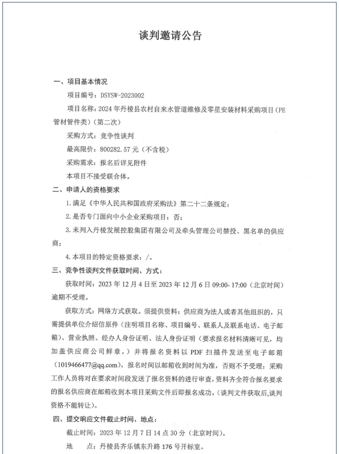 2024年丹棱縣農(nóng)村自來水管道維修及零星安裝材料采購項(xiàng)目(PE管材管件類)(第二次)談判邀請公告